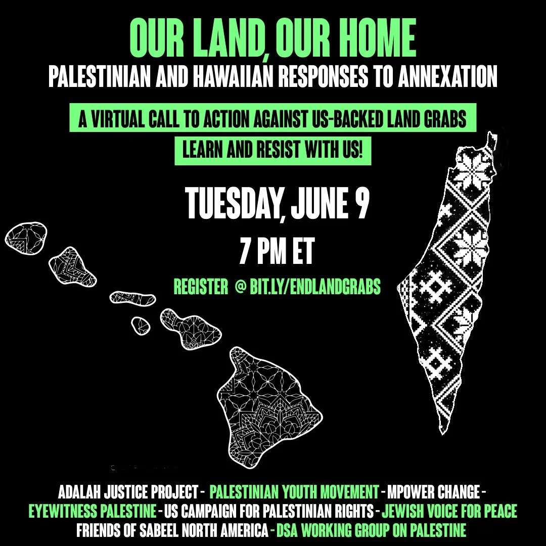 On June 9, a coalition hosted a virtual call to action to hear Palestinian analysis on Israel’s plans to annex land in the West Bank, make connections to US looting of indigenous lands, and get informed about the struggle to protect Mauna Kea in Hawaii. Both the United States and Israel were built on annexation, but the Indigenous people of both places continue to struggle for their homes.